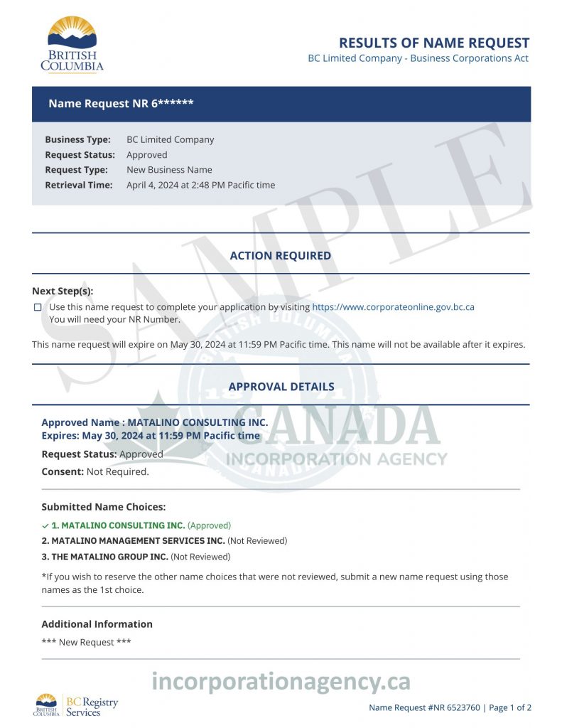 Business name pre-approval is a service that checks whether your proposed name meets federal or provincial rules before submitting your incorporation documents. It helps reduce the risk of name rejection.
