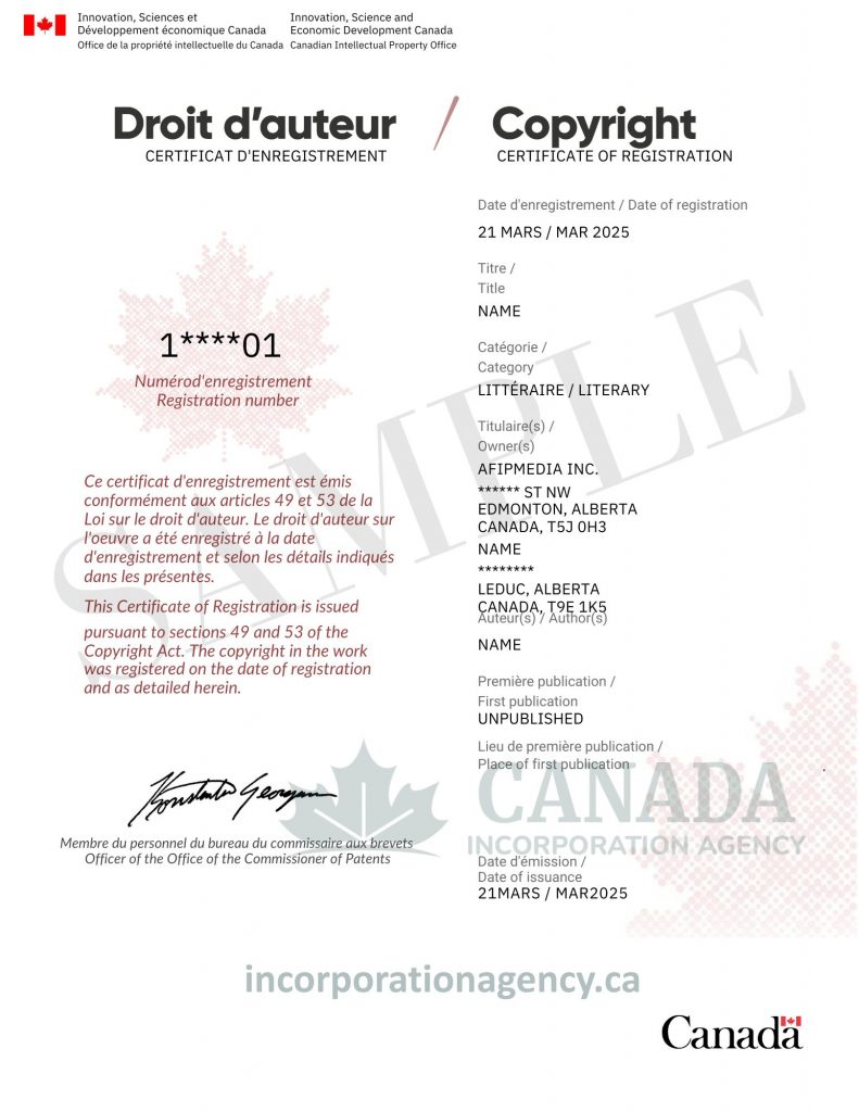 - File a copyright application with the Canadian Intellectual Property Office (CIPO)