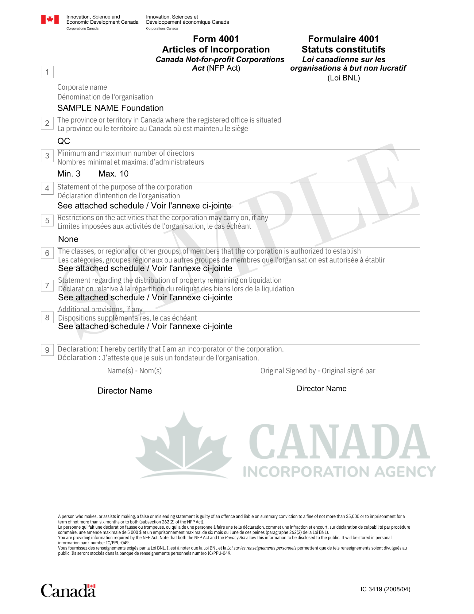 Youโll need a unique organization name (confirmed through a NUANS report), a registered office in Canada, and at least one director. If you plan to apply for charitable status, youโll typically need three unrelated directors.